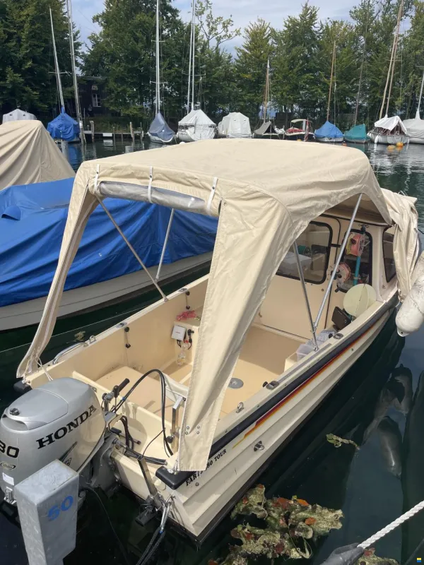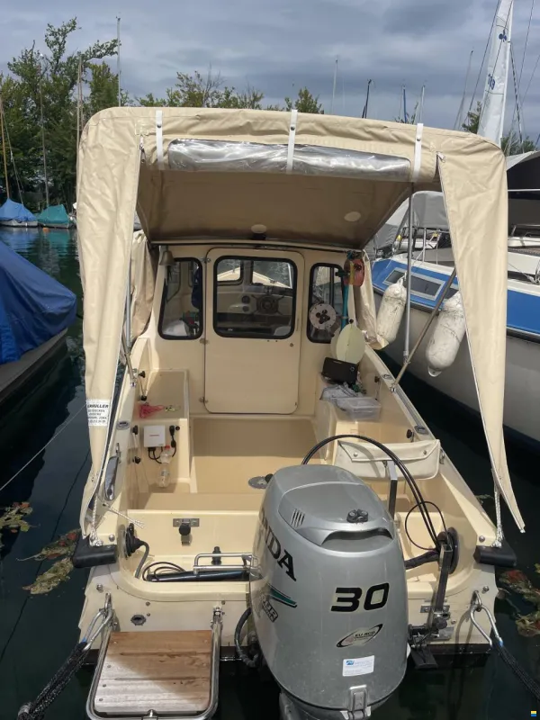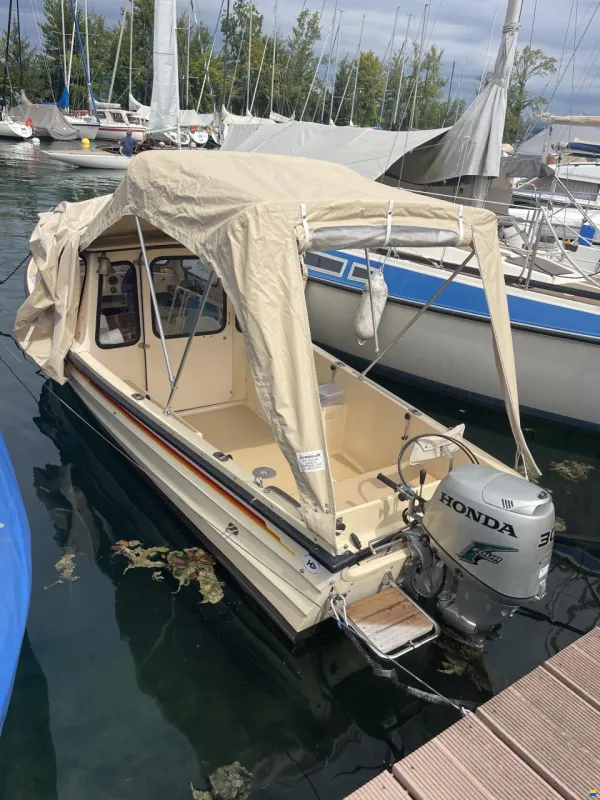 Bateau à partir de contrôle 09.2025, test d²²échappement / service 04.2025, en excellent état, l²²entrée arrière (plate-forme), entrée frontale, Biminitop hauteur debout 1,90 m, inserts latéraux disponibles, peinture sous-marine nouvelle, nouveau sondeur (Humminbird Helix) barre de remorquage avec 2 rouleaux inclus, Support de canne 4 fois (Inox) pour le remorquage dans l'eau avec le chien, pilote automatique de barre franche, 4 supports de moulinet - 2 pour les moulinets de remorquage - 2 pour les moulinets de bridage, divers matériel de pêche de haute qualité (remorquage sous l'eau) peut être acheté à un coût supplémentaire, si désiré