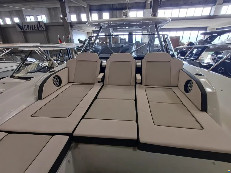 Taud de soleil de pont avant - Toile couvrant 3 sièges de pont - Toile couvrant le canapé en L dans le cockpit, Taud de table - Taud de soleil noir perforé avec mâts en carbone à l'arrière - Taud de soleil noir perforé avec 4 mâts en carbone à l'avant - VHF - 2 écrans GARMIN 16" - GPS - Echo-sondeur - Radar - Système Mercury intégré dans les écrans Garmin pour le contrôle de la consommation de carburant et des paramètres moteur - Tampons de trim Lenco - Radio stéréo intégrée dans les écrans GARMIN FUSION avec subwoofer et amplificateur et fonction bluethoot - No. 3.3 Réfrigérateurs, un dans la cabine et deux dans le cockpit - Toilettes séparées avec cabine de douche séparée, WC électrique et réservoir d'eaux noires - Propulseur d'étrave - Guindeau électrique - Balcon rabattable électriquement avec deuxième échelle de bain - Lumières LED dans le cockpit et la cabine - Paire de lumières sous-marines à l'arrière - Cuisine dans la cabine avec cuisinière à gaz, réfrigérateur et évier - Wetbar dans le cockpit avec grand plan de travail - Deux éviers, deux réfrigérateurs et une glacière IGLOO