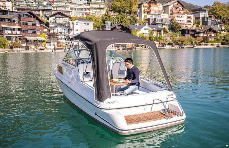 Die Capriole 700 Elektro beherrscht die Kunst der Verwandlung. Einmal eine offene Badeinsel, einmal ein schattiger Ruheplatz und dann ein schützendes Kajütenboot, das die Fahrzeiten auf den Seen erheblich erhöhen kann - abends oder auch bei Regen. Hier ist alles so konstruiert und angeordnet, dass das Wohnen auf dem Boot geradezu zum Genuss wird. Ein kleines Reich, mitten auf dem Wasser. Die erhöhte Sitzposition des Kapitäns vermittelt das Gefühl der Erhabenheit und des Überblicks. Probleme mag es im Alltag und an Land geben, nicht aber hier auf der Capriole. Sie wurde geschaffen, um völlig unabhängig von Wetter und Sorgen zu sein.