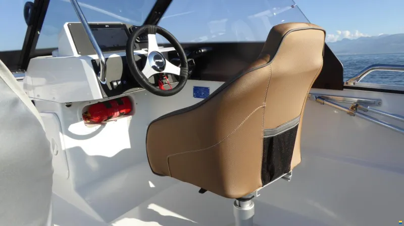 Beim neuen Hawk BR (mit Bodenseezulassung) gibt es mehr Platz im Cockpit sowie wurde der Gewichtsschwerpunkt optimiert, dies spürt man sofort beim fahren mit dem Boot. Kein aufsteigen - Boot kommt sofort ins Gleiten und liegt sehr sanft im Wasser. Durch die massiven Kimmleisten spritzt auch kein Wasser in das Boot. Die hinterbelüfteten Frontscheiben sowie viele durchdachte wassergeschützte Stauräume überzeugen sofort. Unter der hochklappbaren Heckbank ist die Heck/Fahrpersenning verstaut und bieten noch viel Platz für persönliche Gegenstände.