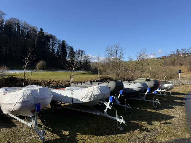 Modell 435: 2 Boote (435R) an Lager (1x hellgrau, 1x dunkelgrau), Trailer und einige Motoren (auch Occasion) ebenso an Lager. Siehe beigefügte PDF für Preisliste und Beschreibung.