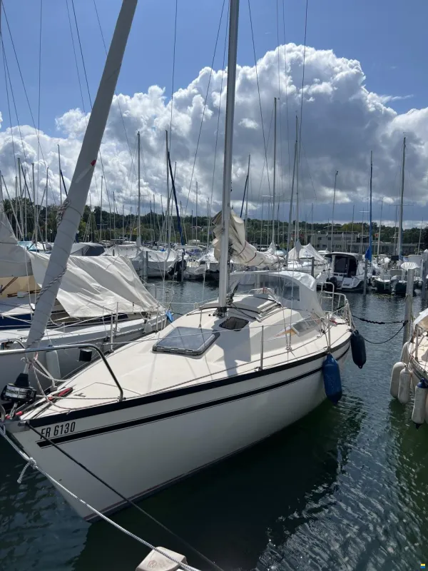 Bénéteau First 25 ancien, assez bien conservé, avec quille pivotante. Il est équipé d?un moteur hors-bord 8 cv fixe dans le puits avec démarreur électrique. Il navigue avec une grand-voile lattée et un grand génois (tous deux Elvström) avec enrouleur. Peut très bien être navigué en solitaire. Bateau idéal pour les débutants en voile, pas besoin de permis moteur, seulement un permis voile. Avec la quille pivotante, même les eaux peu profondes peuvent être naviguées. Le bateau a été récemment testé (9.9.2025) et le dernier service moteur et le contrôle des émissions a eu lieu en Janvier 2025. Cuisinière à alcool à deux feux disponible, WC avec porta potti, le réservoir d?eau n?était plus utilisé, mais pompe à eau fonctionnelle disponible.