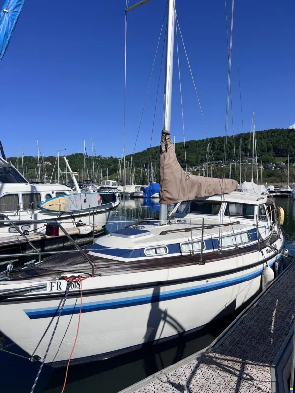 Yacht de propriétaire bien entretenu avec un bon équipement. Nouvelle cabine à gâteau 2018, nouvelle électronique 2003 avec plate-forme de bain (longueur totale : 9,70 m). Solide, belle finition en teck. Le Mascot 910 se trouve dans le port de Cheyres FR sur le lac de Neuchâtel et peut être visité sur rendez-vous. Sans amarrage !